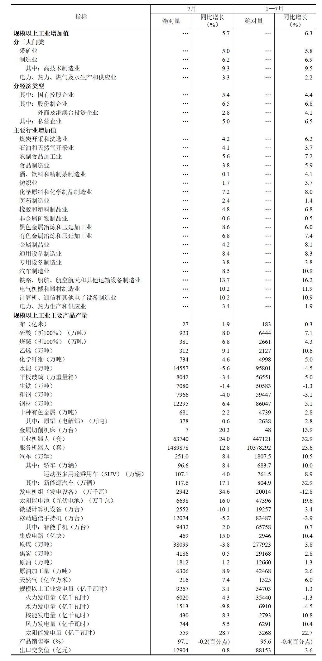2025年7月份規(guī)模以上工業(yè)生產(chǎn)主要數(shù)據(jù)