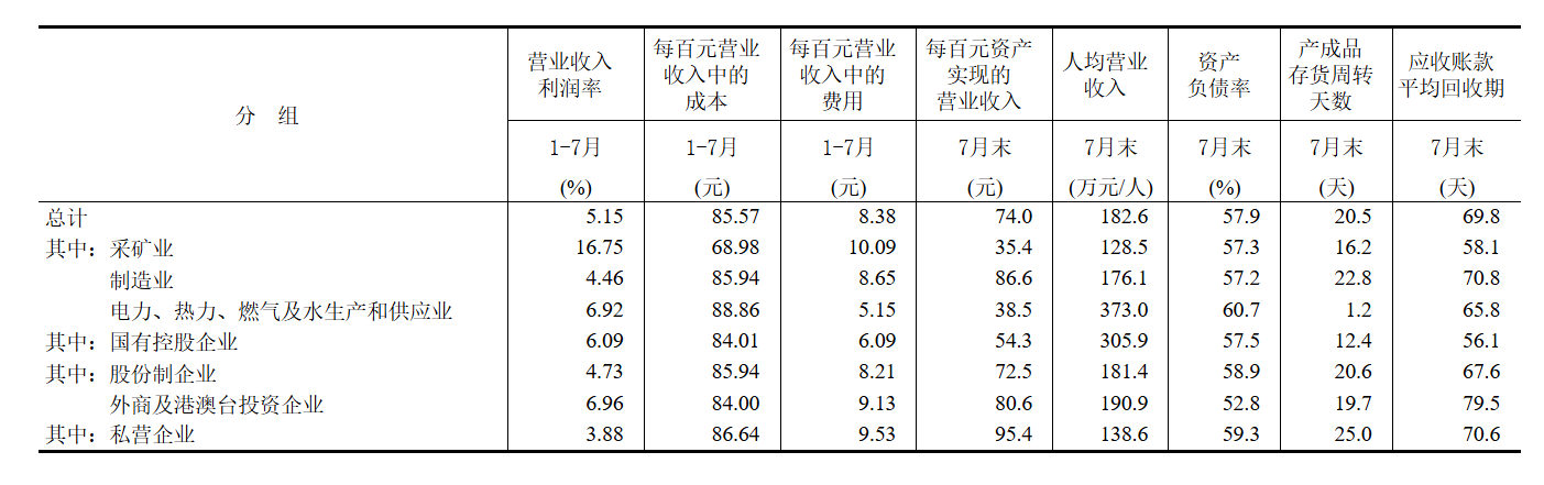 1—7月份,規(guī)模以上工業(yè)企業(yè)實(shí)現(xiàn)營(yíng)業(yè)收入78.07萬億元,同比增長(zhǎng)2.3%;發(fā)生營(yíng)業(yè)成本66.80萬億元,增長(zhǎng)2.5%;營(yíng)業(yè)收入利潤(rùn)率為5.15%,同比下降0.21個(gè)百分點(diǎn)。
